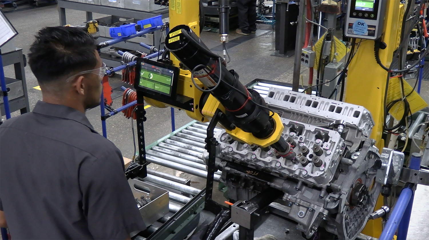The bolt sequence for the Duramax is programmed into the tool, ensuring that the procedure is followed consistently. Any bolts identified by the program as being beyond their fatigue limit are discarded by the Associate. Furthermore, the data system automatically adjusts torque settings, eliminating the need for multiple torque wrenches to cover different torque ranges at a single station.
