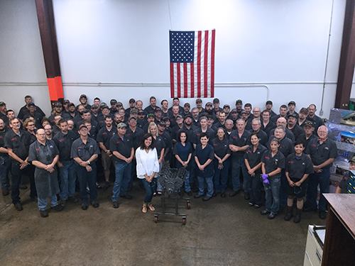 Ginger Ravella, a Folds of Honor recipient, recently posed with a JASPER® remanufactured Chevy 350 engine, and the JASPER Associates who produced it at our Willow Springs, MO facility.