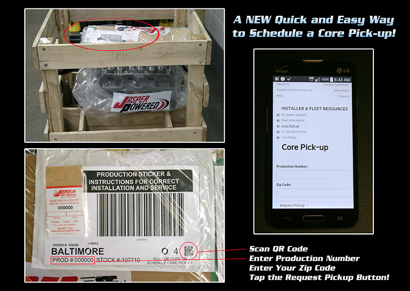 Moving forward, June 1st, 2016 and after, all JASPER Products being produced will include a Core Pick-up QR Code at the lower right folded corner of the Customer Installation Instructions. To use this convenient new service, all you will need is a smartphone or tablet with a QR Code Reader App (which can be downloaded for free from most App Stores). Simply open a QR Code Reader App, scan the Core Pick-up QR Code, enter the Production Number located at the lower left folded corner of the Customer Installation Instructions, enter your zip code and tap the Request Pickup button. You’re done! It’s just that easy. Customers will also still be able to schedule a core pick-up without the QR Code on the JASPER website or by phone. This QR Code is just another way JASPER can add convenience to you and your busy schedule.