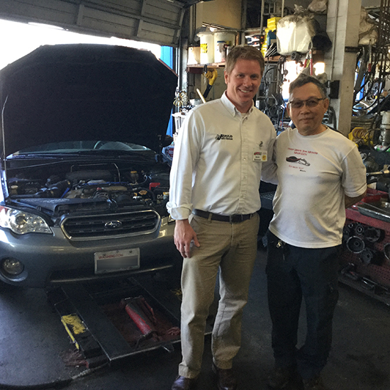 Frank the Owner of Lioe’s Automotive Service and I discussing Subaru engine updates and building processes at his shop in Seattle, WA.