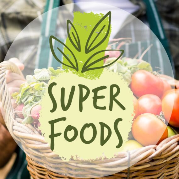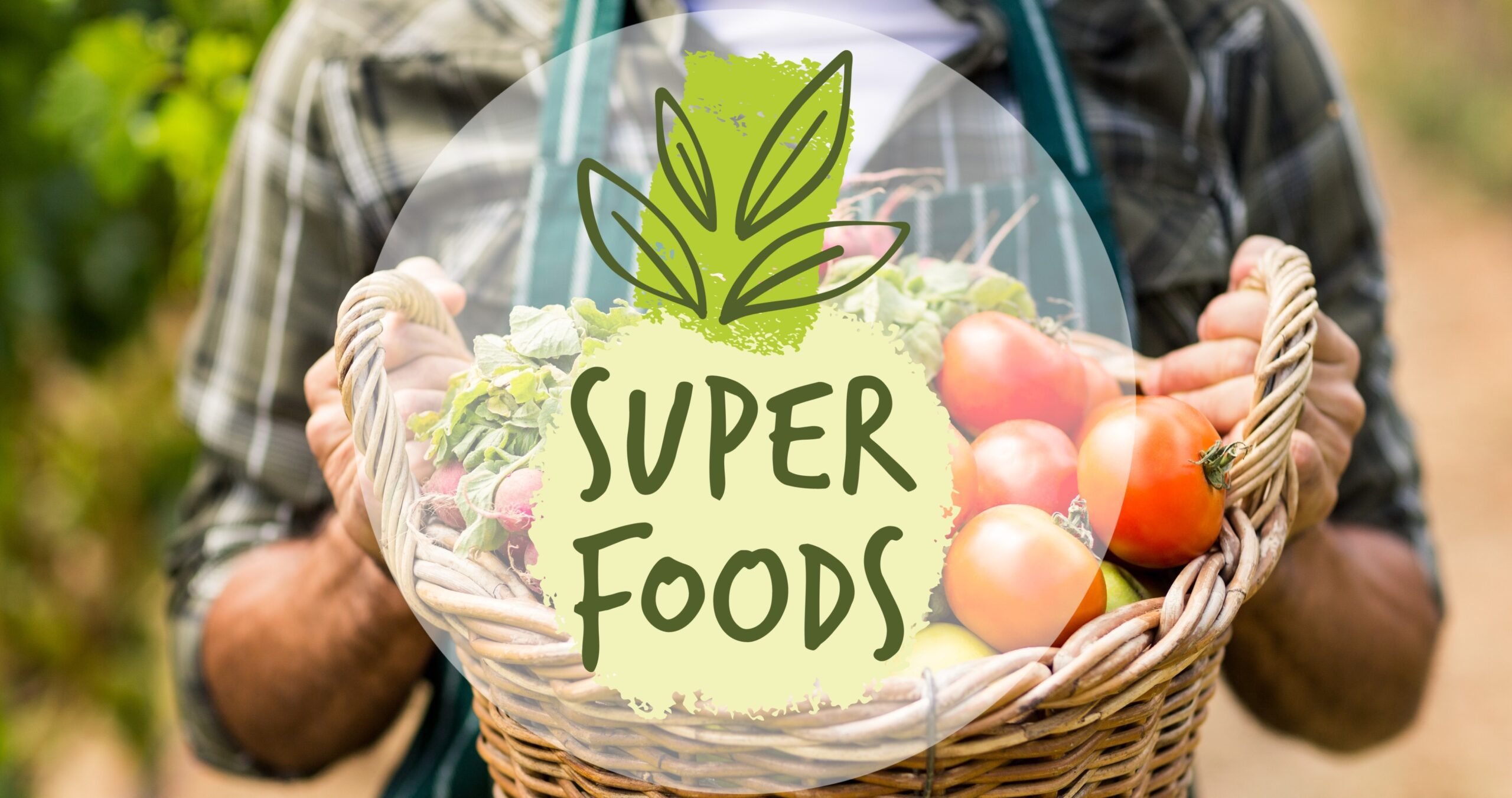Digital composite image of super foods symbol over man holding basket full of vegetables