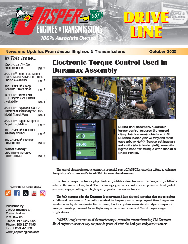 Features: Customer Profile: National Tire & Auto, JASPER® Partners with Find A Wrench to Help Shops Recruit Skilled Service Technicians, JASPER® Offers Remanufactured Ford 3.5L EcoBoost Turbo GDI Engine, Electronic Torque Control in Gas Assembly, 2021 JASPER® Calendar Entries Deadline July 1st, Scott Shipman: Bigger Than Myself, A Quick and Easy Way to Mark Your Core Pickup!, Joe McDonald: Service Advisor Expectations, Bob Cooper: Six Tips on Generating More Repeat Business